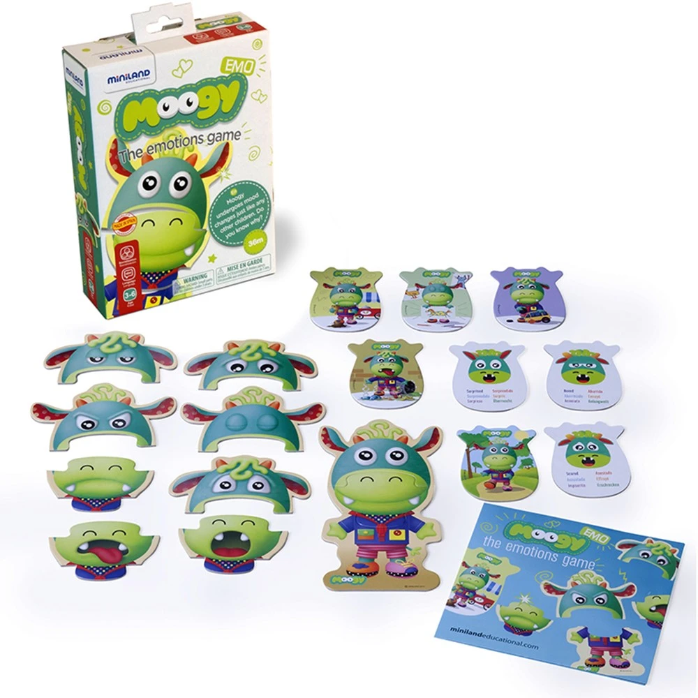 This game will help children identify the emotions and disclose their feelings. They will find out why we feel happy, sad, surprised, bored, satisfied, angry, disgusted, frightened, etc. Watching Moogy will teach them a little about themselves. Includes 11 puzzle pieces and 8 emotions cards.
