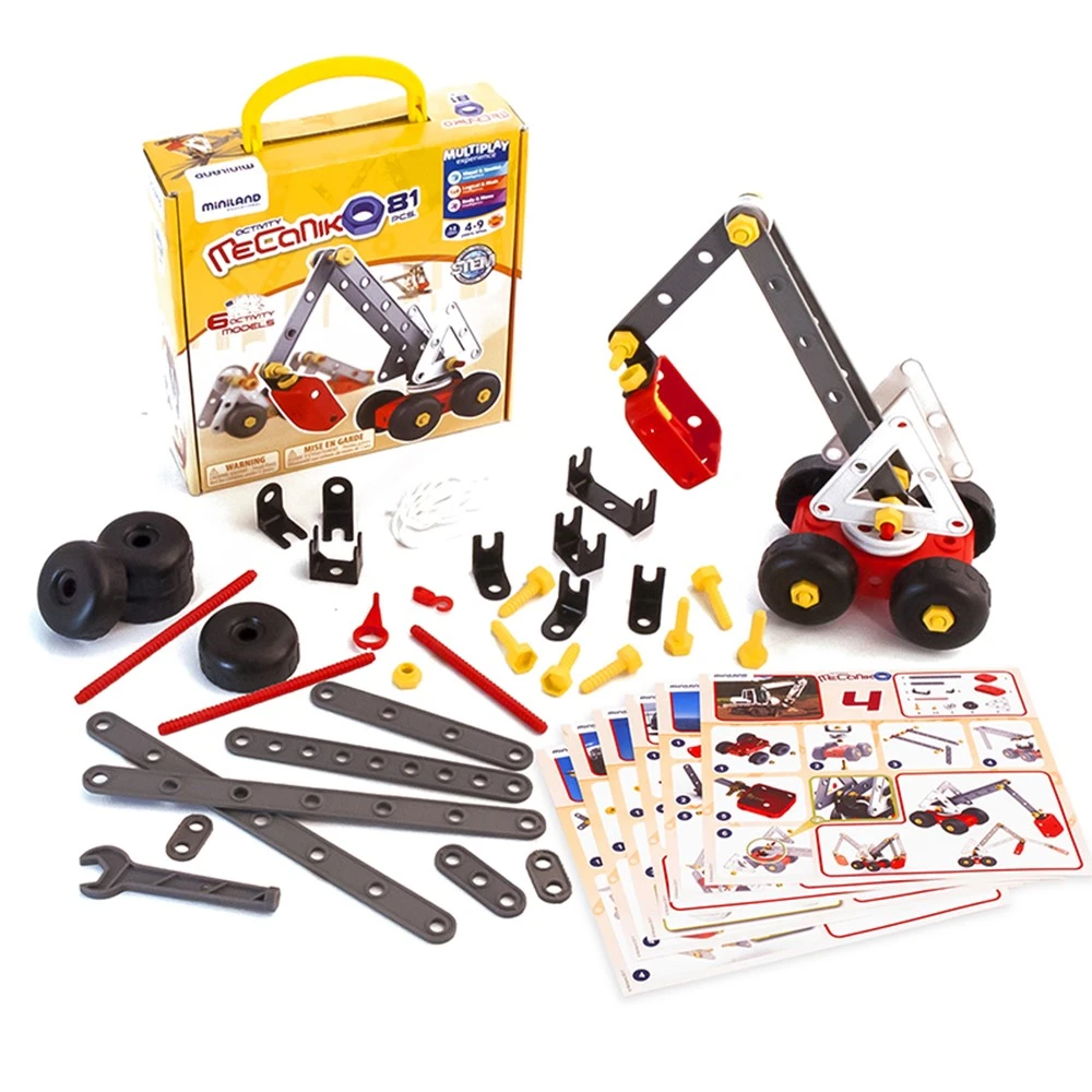 Every young engineer can build objects from the real world. The set is made of durable plastic and includes a spanner, screws, pulleys, nuts, etc. To encourage children’s abilities, 6 large sheets detailing the construction of various designs are included. Each set includes 81 pieces and 6 activity cards.