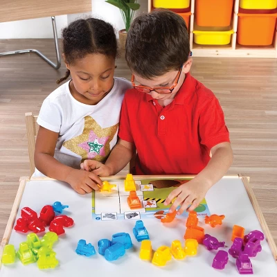 This game is all about cars! This set of 36 bright and chunky plastic vehicles features 10 activity cards of 5 games at different levels of difficulty. Help your child or student develop fine-motor skills, patterning and sequencing abilities, spatial orientation, shapes, and colors.Great for playing at home or in small groups.