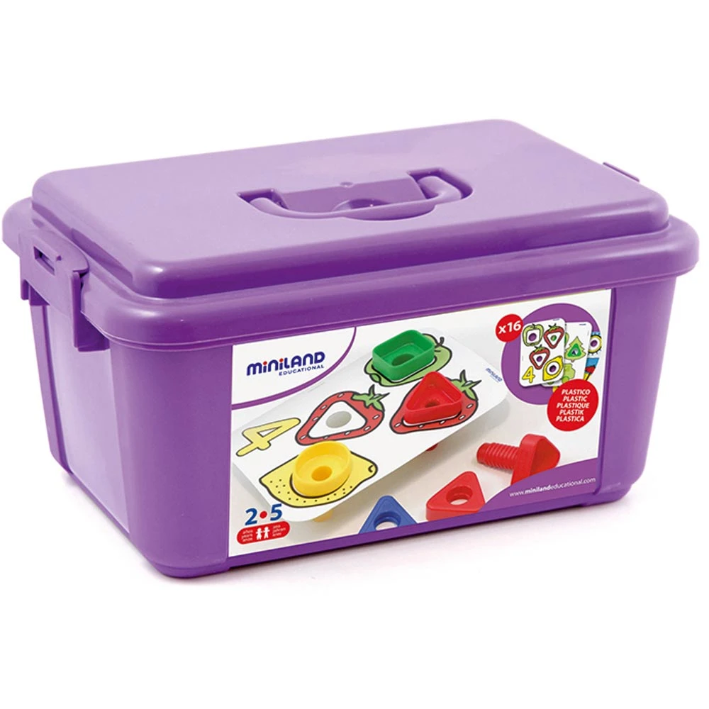 Miniland’s 72-piece set Nuts and Bolts can help children learn colors and shapes, while having fun. Assorted nuts and bolts shaped like circles, squares and triangles, come in bright red, blue and yellow. Kids must match the shapes to put the nuts and bolts together. Figuring out which pieces fit helps children practice problem solving, and develops hand-eye coordination and small motor dexterity. The nuts and bolts come with a set of plastic activity worksheets. Activities have been tested in schools, and highly rated by teachers, for teaching color and shape recognition. Miniland Educational, a leading toy manufacturing company with production facilities in Onil, Spain, is known worldwide for safe, high-quality educational toys. A great deal of thought and research goes into design and production of Miniland Toys, but we never forget the importance of play. Manufactured according to strict European Union safety guidelines. Made of highly resilient plastic. Bolts are 2-1/2″ long and nuts are 1-3/4″ across. Suitable for children 3 years and older.